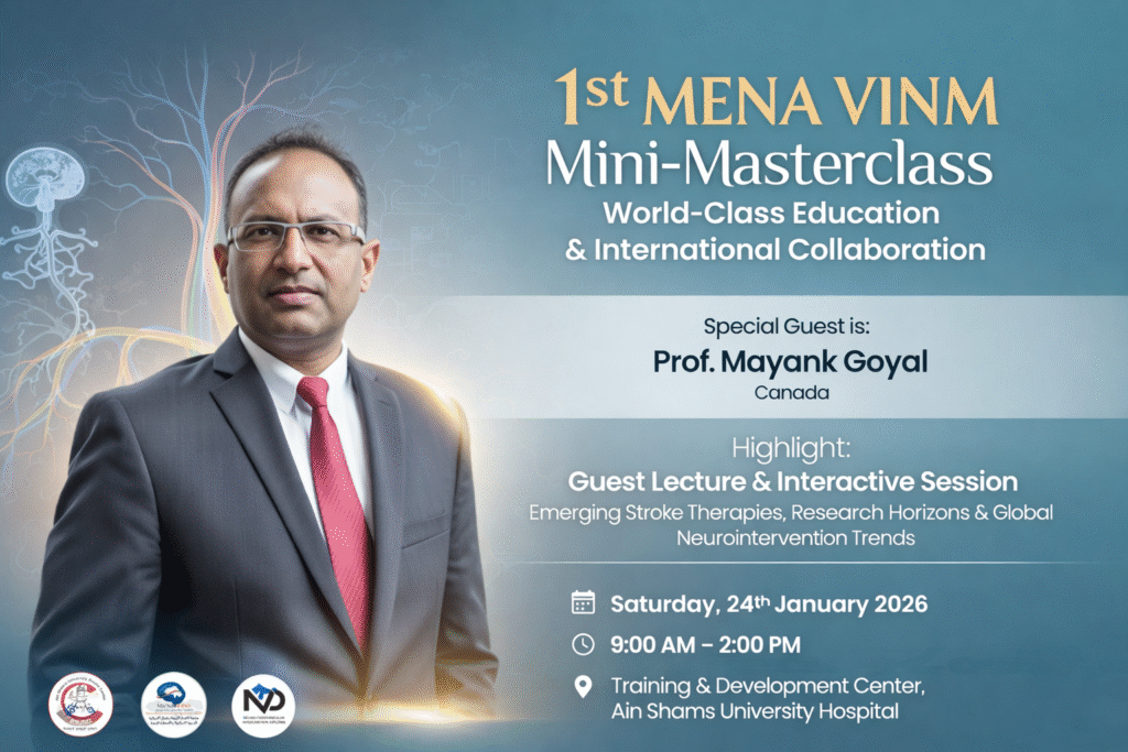 The upcoming workshop holds exceptional importance as it will host Prof. Mayank Goyal (Canada), one of the world’s most influential figures in neurointervention and stroke imaging. Prof. Goyal’s groundbreaking contributions have played a pivotal role in shaping modern endovascular stroke therapy, and his participation highlights the growing international recognition of the MENA-VINM program.